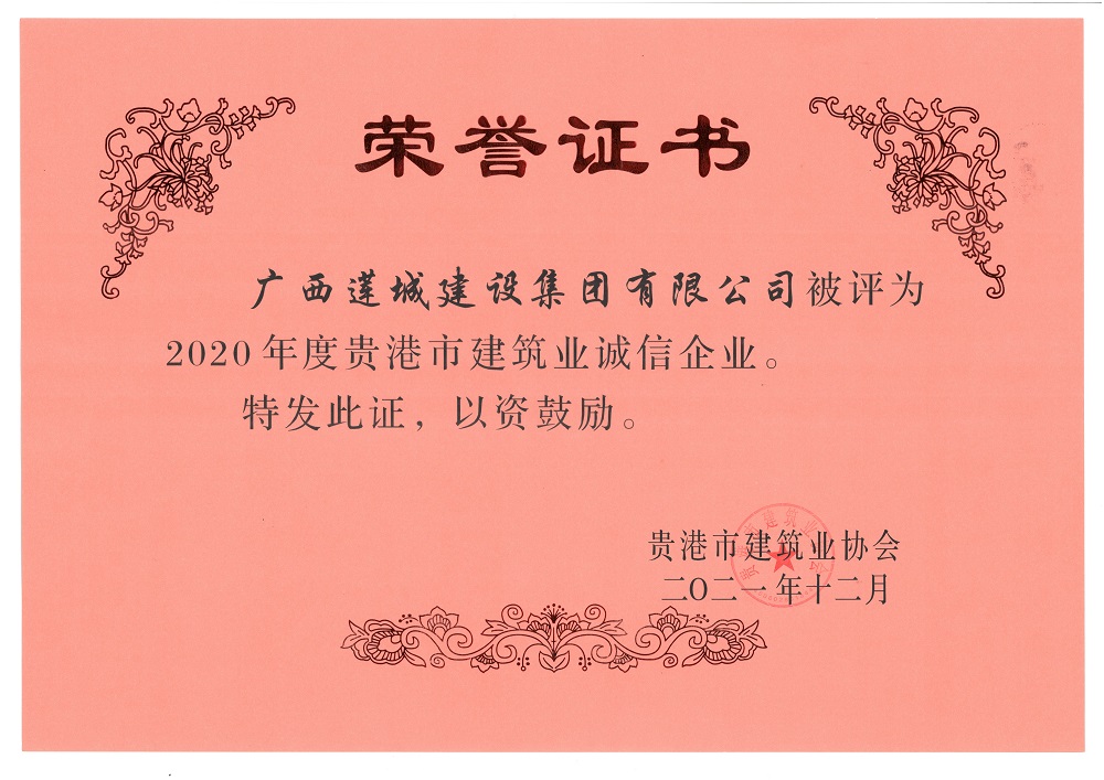 2020年度贵港市建筑业诚信企业2020年度贵港市建筑业绿色施工先进单位2020年度贵港市建筑业先进企业陈梦华,优秀企业经理岑毅,优秀建造师邓春毅,优秀建造师黄文静,优秀建造师梁锦助,优秀建造师莫若毅,优秀建造师陶静雯,优秀建造师梁锦助,优秀建造师陶静雯,优秀建造师2021-2022年度广西地区优秀施工企业2021年第一批广...