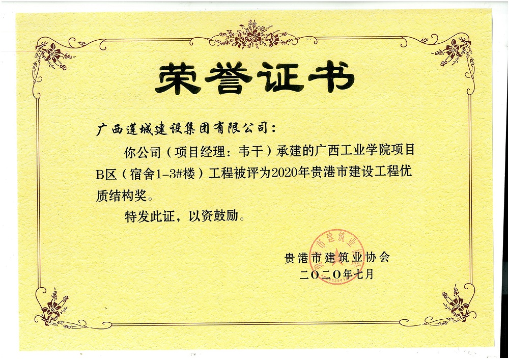 2020年贵港市建设工程优质结构奖广西工业学院项目B区(宿舍1-3#)工程