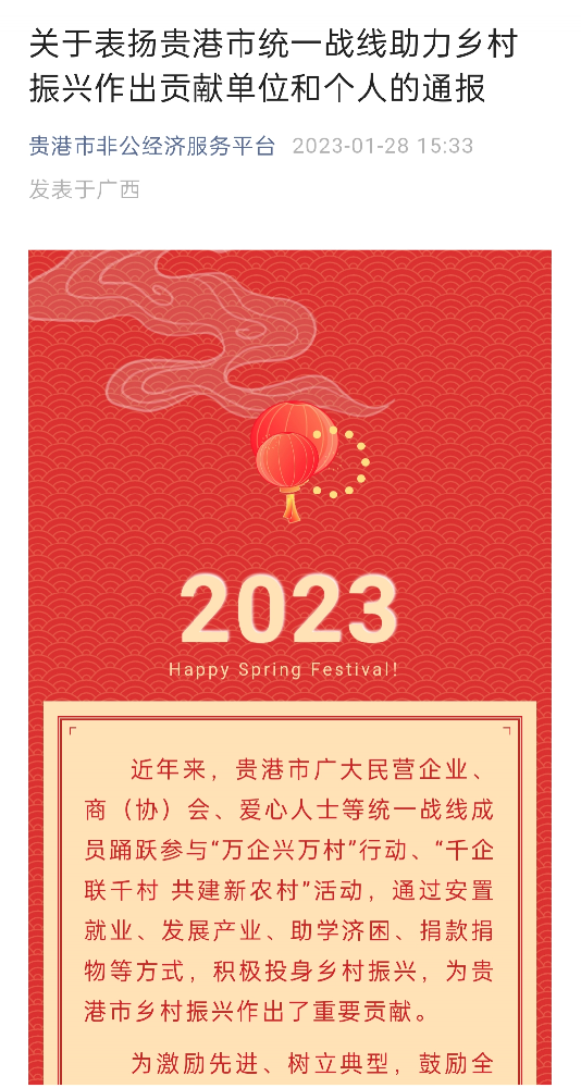 今天是农历癸卯年正月初七,电玩森林舞会_森林舞会游戏-官方授权认证获得了中共贵港市委统战部、贵港市工商业联合会、贵港市光彩事业促进会对公司及陈梦华总经理的通报表扬,对yp森林舞会多人版建设集团及陈梦华总经理多年以来一直踊跃参与“万企兴万村”行动、“千企联千村 共建新农村”活动,通过安置就业、发展产业、助学济困、捐款捐物等,为贵港市乡村振兴作出的重要贡献给予肯定及嘉奖!