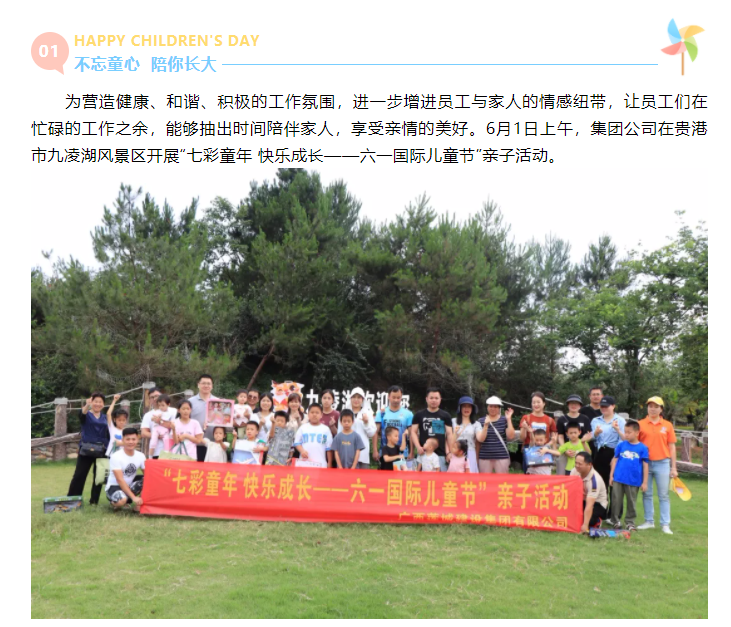 为营造健康、和谐、积极的工作氛围,进一步增进员工与家人的情感纽带,让员工们在忙碌的工作之余,能够抽出时间陪伴家人,享受亲情的美好。6月1日上午,集团公司在贵港市九凌湖风景区开展”七彩童年 快乐成长--六一国际儿童节“亲子活动。...