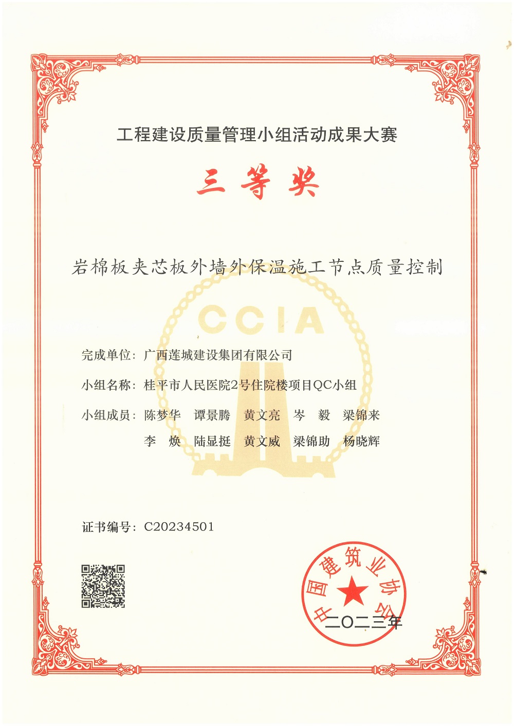 岩棉板夹芯板外墙外保温施工节点质量控制,QC三等奖,桂平市人民医院2号住院楼项目