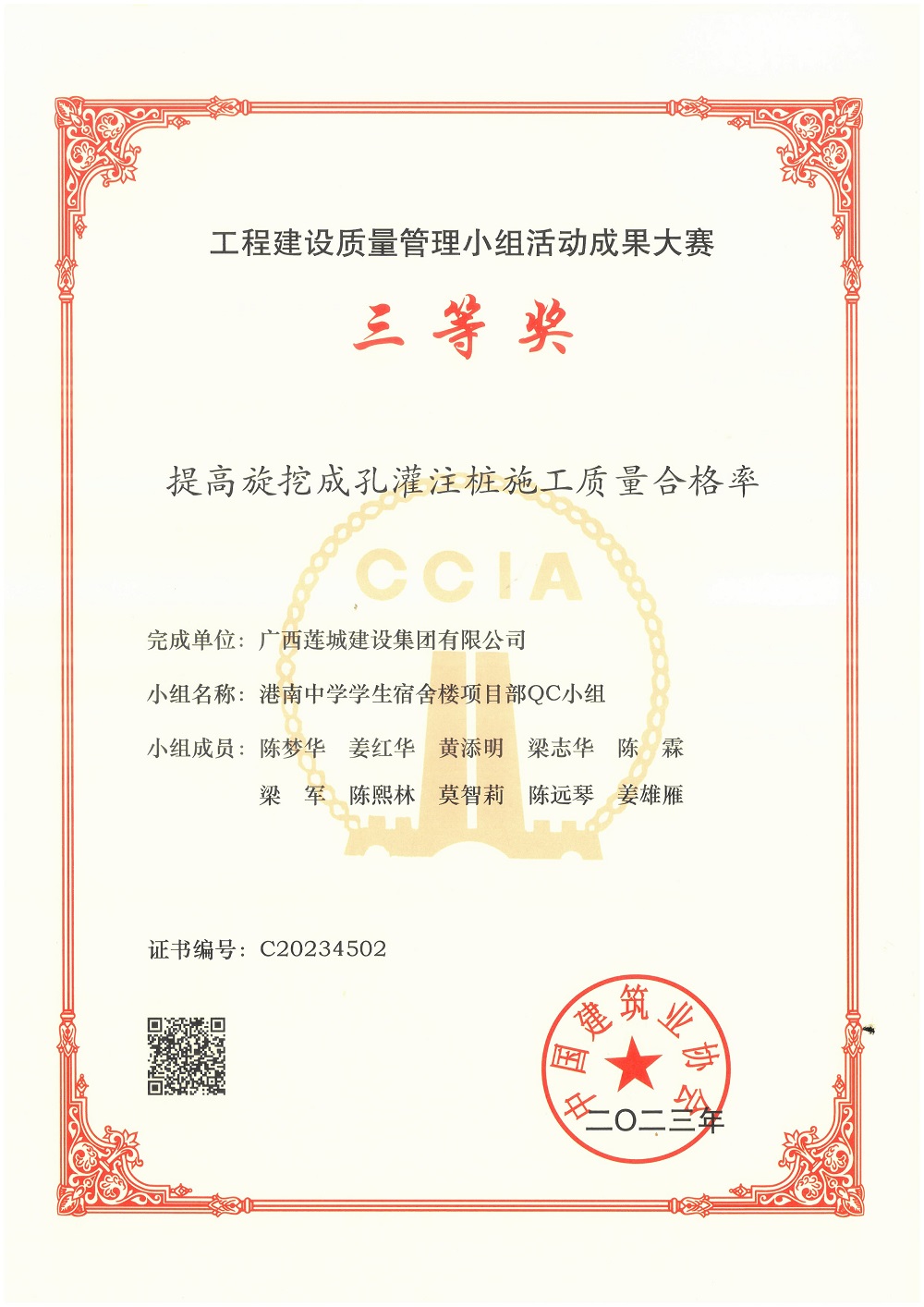 提高旋挖成孔灌注桩施工质量合格率,QC三等奖,港南中学学生宿舍楼项目部