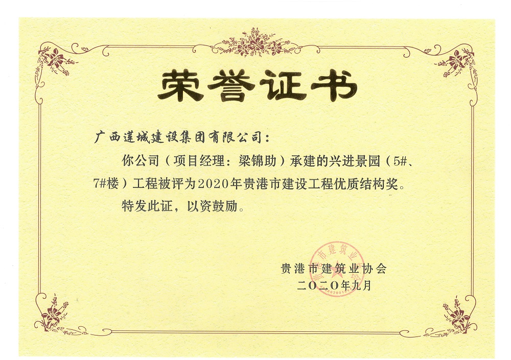 2020年贵港市建设工程优质结构奖兴进景园(5#、7#)工程,项目经理:梁锦助