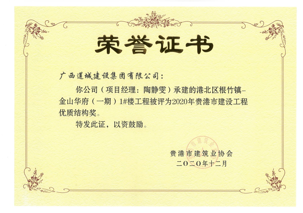 2020年贵港市建设工程优质结构奖港北区根竹镇-金山华府(一期)1#楼工程,陶静雯