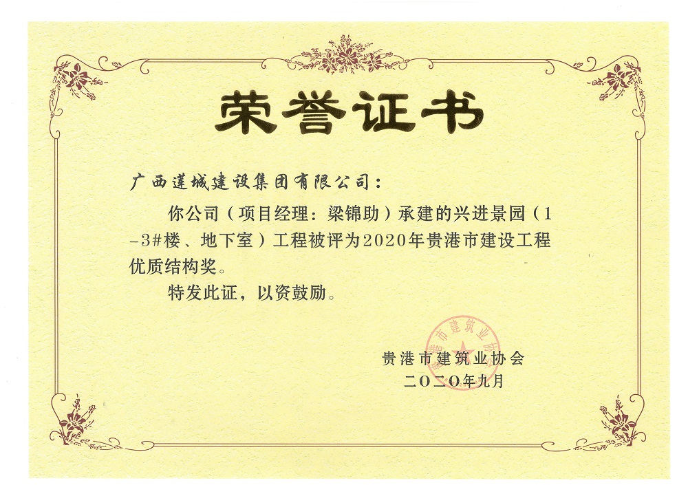 2020年贵港市建设工程优质结构奖兴进景园(1-3#楼、地下室)工程,项目经理:梁锦助