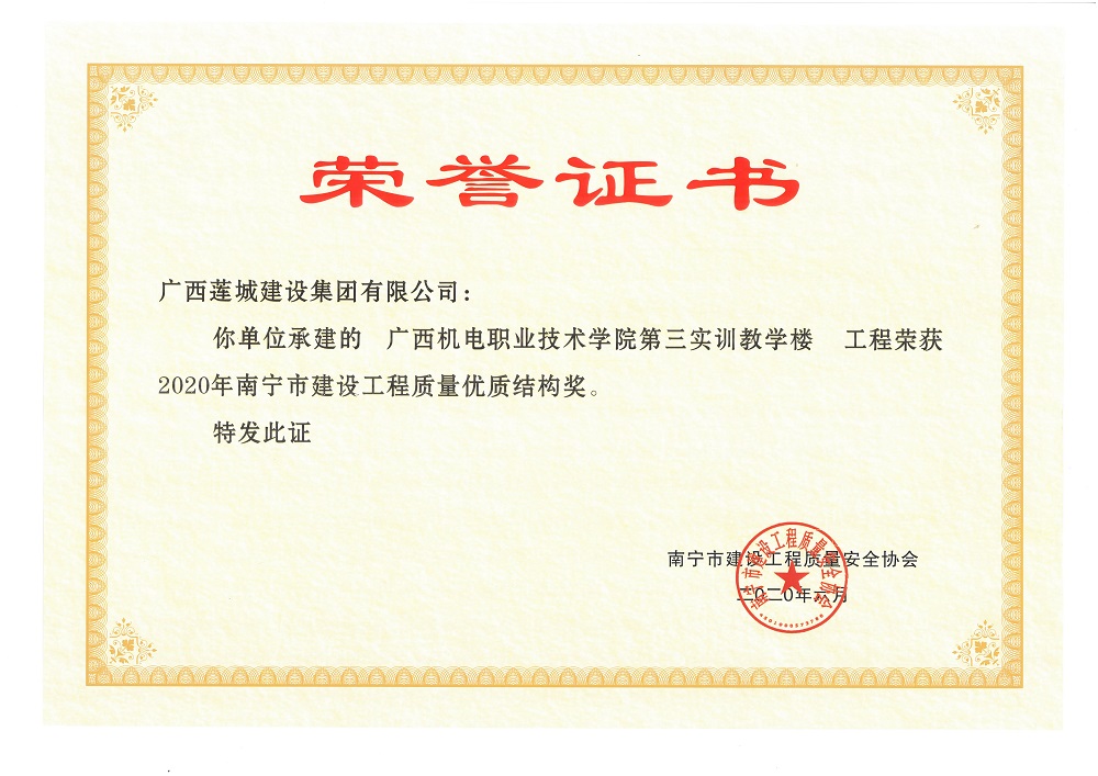 2020年南宁市建设工程质量优质结构奖广西机电职业技术学院第三实训教学楼