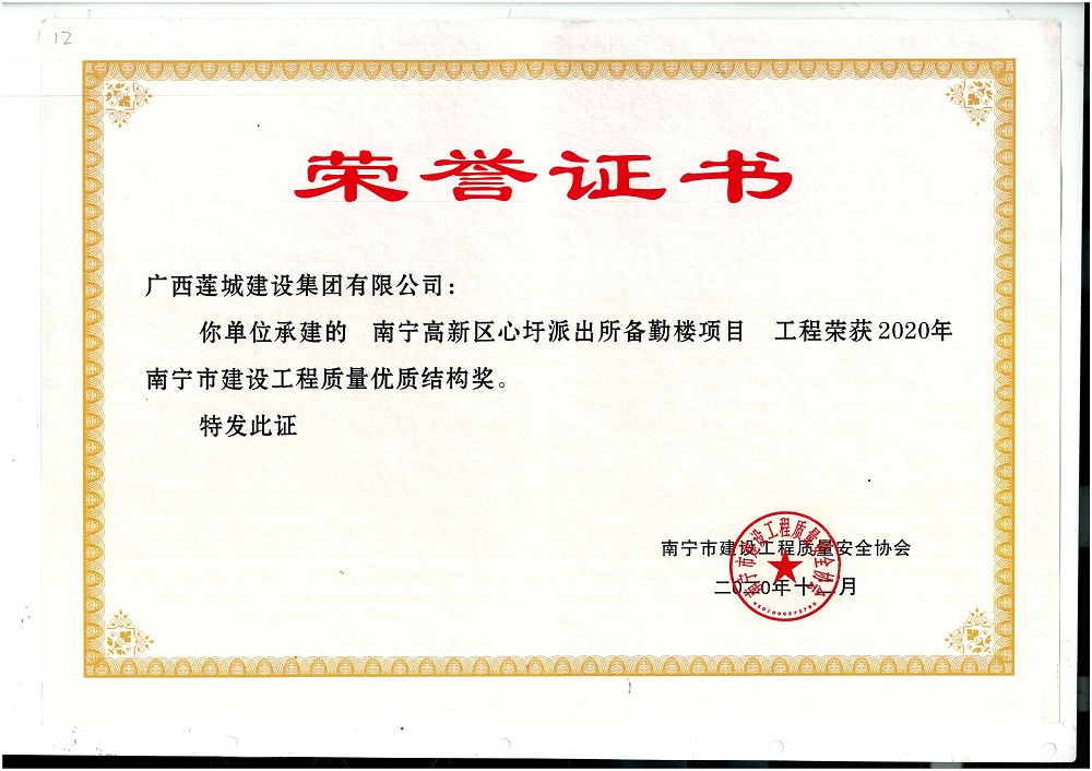 2020年南宁市建设工程质量优质结构奖南宁高新区心圩派出所备勤楼项目