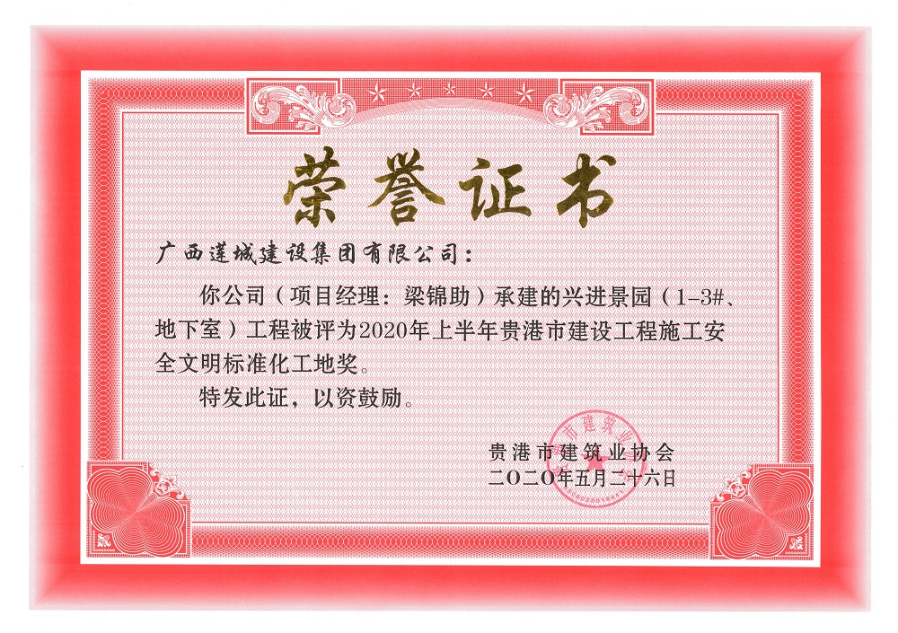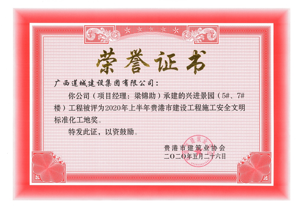 2020年上半年贵港市安全文明工地(市级)兴进景园(5#、7#楼)工程,项目经理:梁锦助