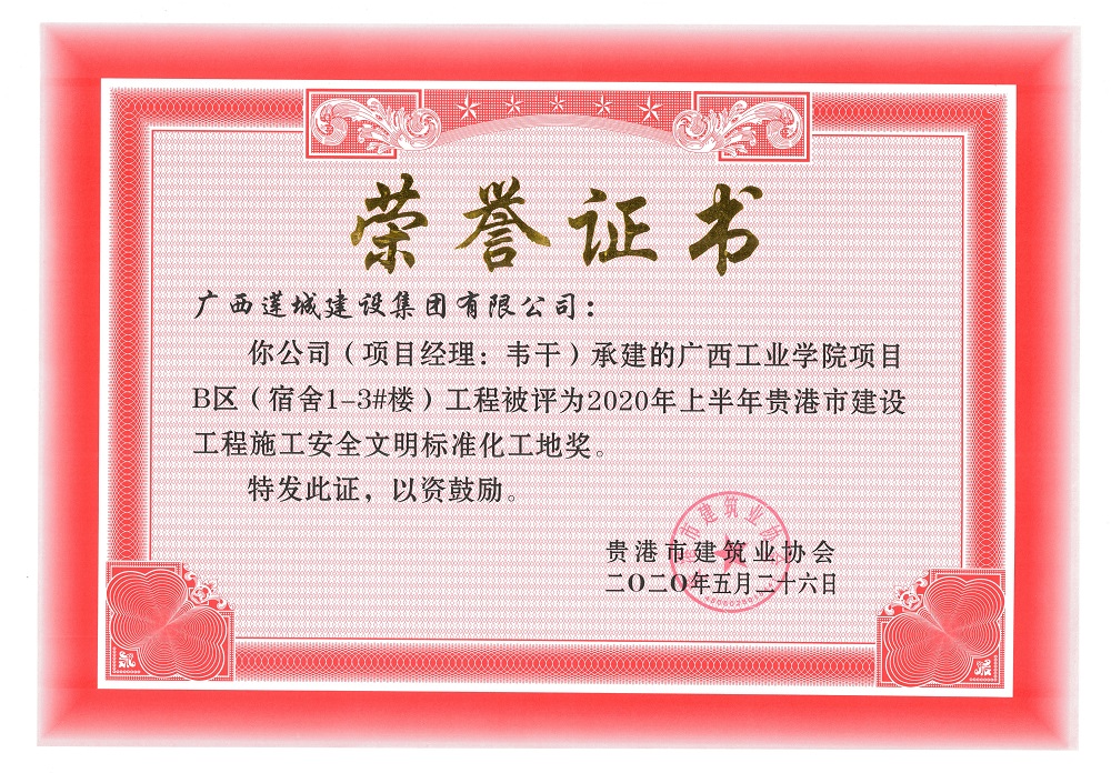 2020年上半年贵港市安全文明工地(市级)广西工业学院项目B区(宿舍1-3#楼)工程,项目经理:韦干