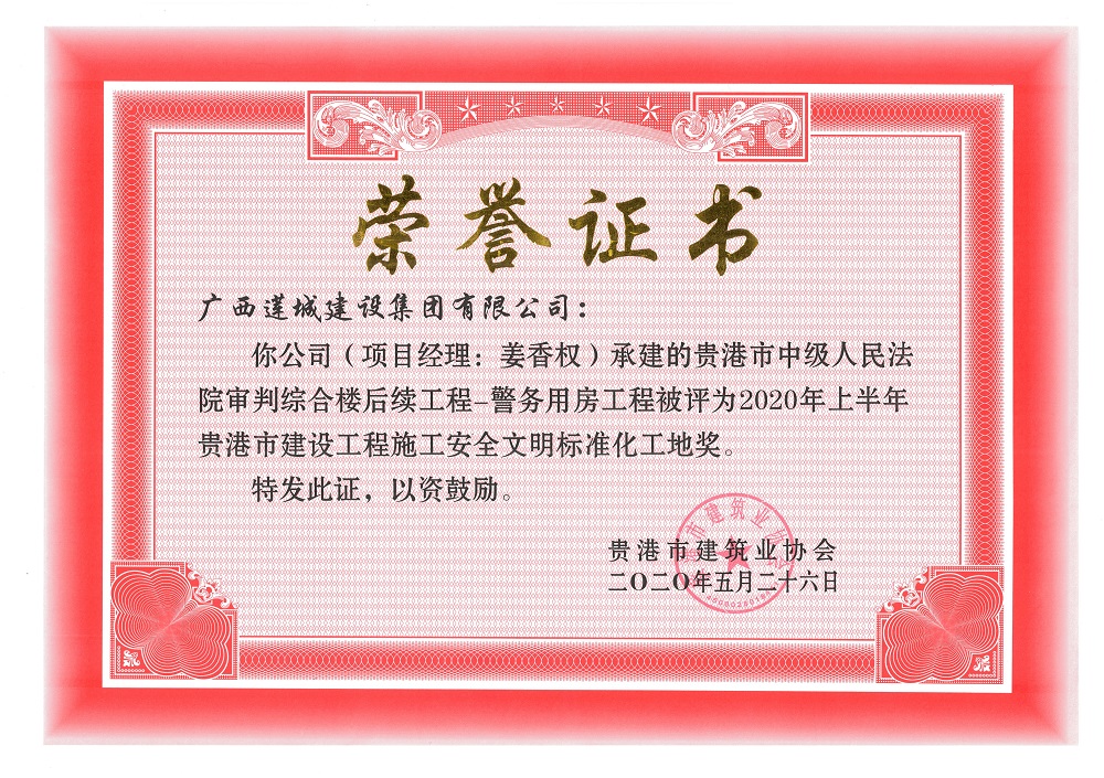 2020年上半年贵港市安全文明工地(市级)贵港市中级人民法院审判综合楼后续工程-警务用房工程,项目经理:姜香权