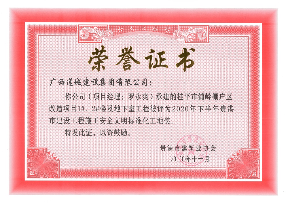 2020年下半年贵港市安全文明工地(市级)桂平市铺岭棚户区改造项目1#、2#楼及地下室,项目经理:罗永爽