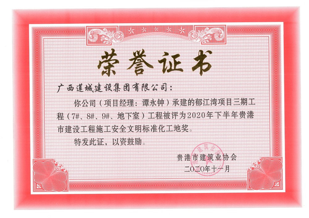 2020年下半年贵港市安全文明工地(市级)郁江湾项目三期工程(7#、8#、9#、地下室),项目经理:谭永钟