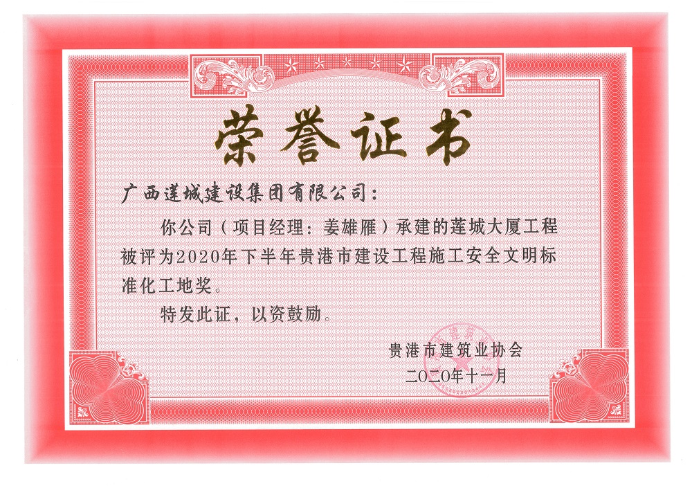 2020年下半年贵港市安全文明工地(市级)yp森林舞会多人版大厦工程,项目经理:姜雄雁,
