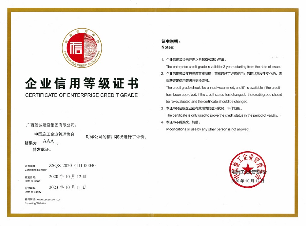 中国企业信用等级证书AAA