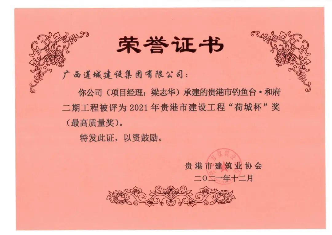 经贵港市建筑业协会评选公示,集团公司承建的贵港市钓鱼台·和府二期工程,贵港市港北区高级中学教学楼工程,贵港市港南区江南消防站项目工程,贵港市检察院办案和专业技术用房、地下训练场工程,贵港市中心血站搬迁重建项目(一期)业务楼工程等5个项目被评为2021年贵港市建设工程“荷城杯”奖(最高质量奖)。