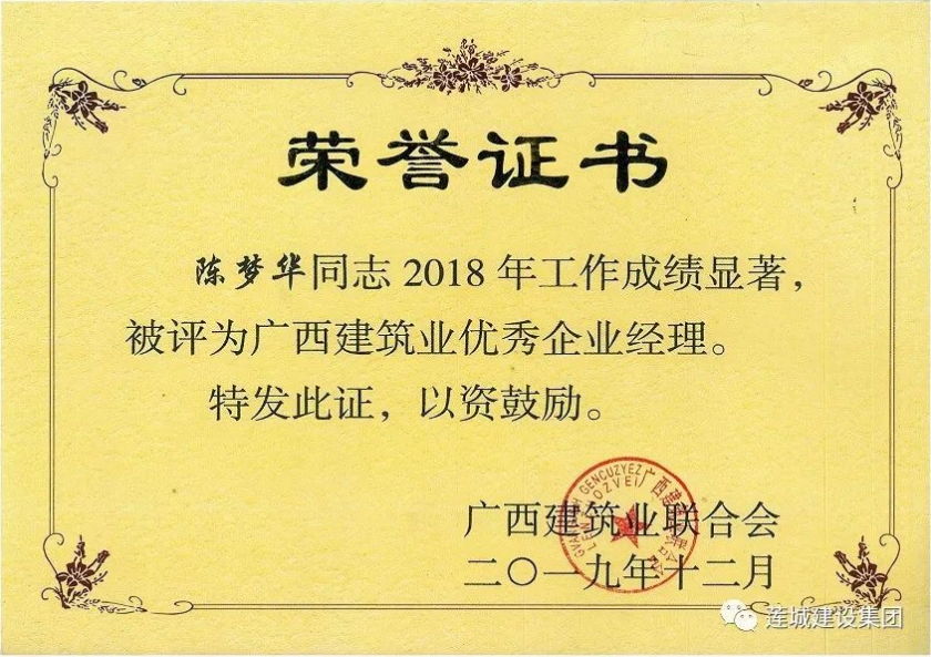 陈梦华总经理获颁2018年度“广西建筑业优秀企业经理”,黄东汛获颁2018年度“广西建筑业优秀建造师”,黄文亮、姜红华、谭景腾等15人获颁2018年度“广西建筑业安全生产先进工作者”。
