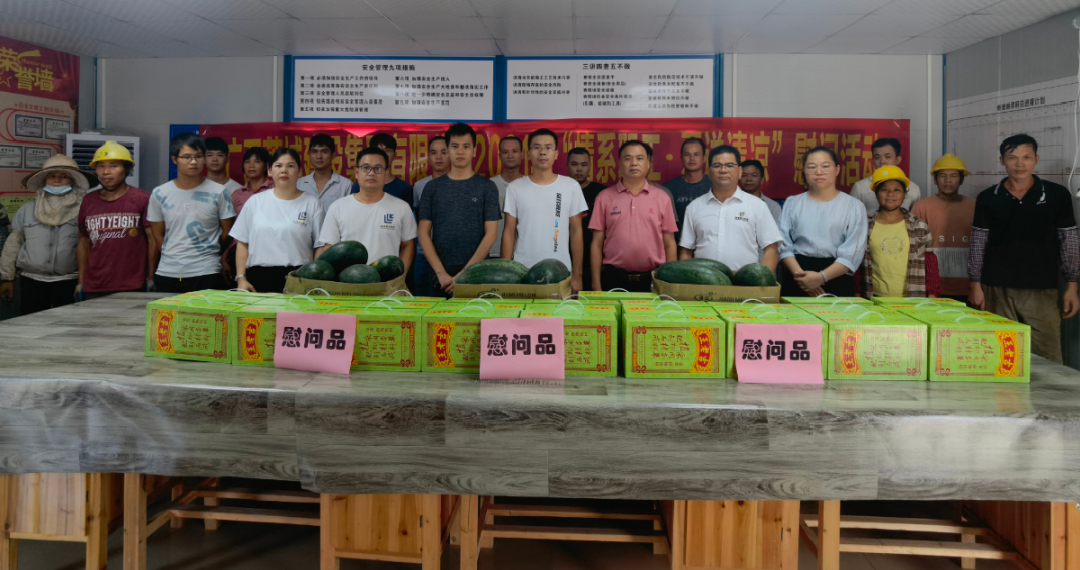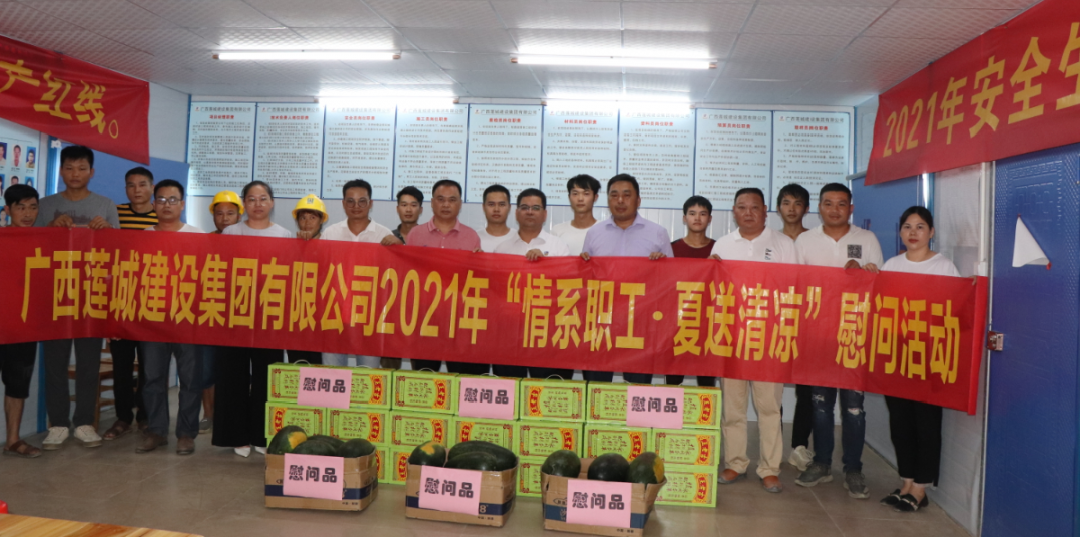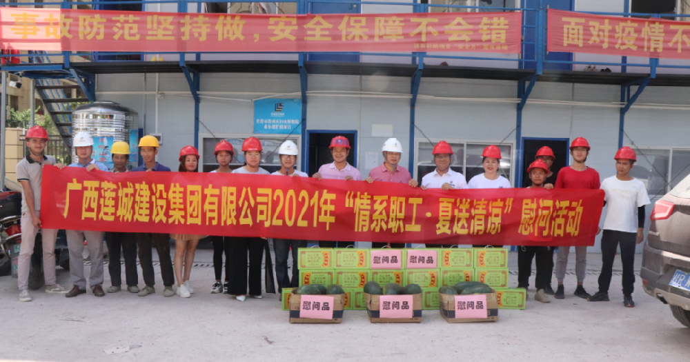 为切实做好夏季防暑降温工作,关心和维护职工身心健康,8月25日下午,集团公司副总经理、总工程师姜红华,总经理助理、经营处处长谢乔勇等一行6人前往港南区妇幼保健院项目、顺祥府项目、贵港市西江产业园科创产业基地开展“情系职工 夏送清凉”慰问活动,对在酷暑难耐的炎热天气中仍坚守工作岗位的项目基层职工进行慰问,并送上王老吉、西瓜等清凉饮品。