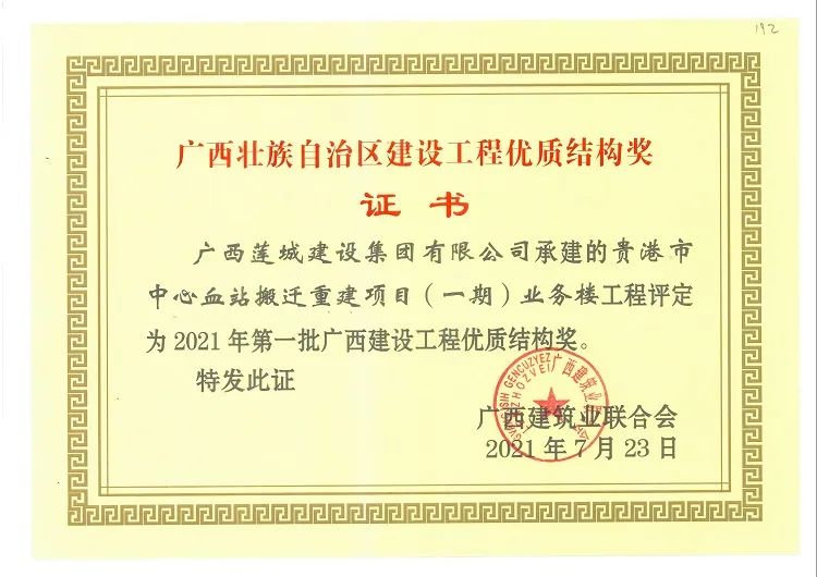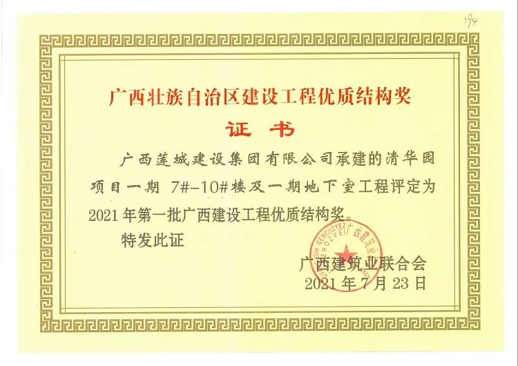 近日,由集团公司承建的龙凤江城1#、2#、3#楼及地下室、清华园项目一期7#-10#楼及一期地下室、贵港市中心血站搬迁重建项目(一期)业务楼等三个项目获评“2021年第一批广西建设工程优质结构奖”;桂平市人民武装部营院易地搬迁工程、兴进景园6#8#9#10#楼、贵港市西江产业园科创产业基地项目(一期)、桂平市第一中学教学综合楼等四个项目获评“2021年贵港市建设工程优质结构奖”。