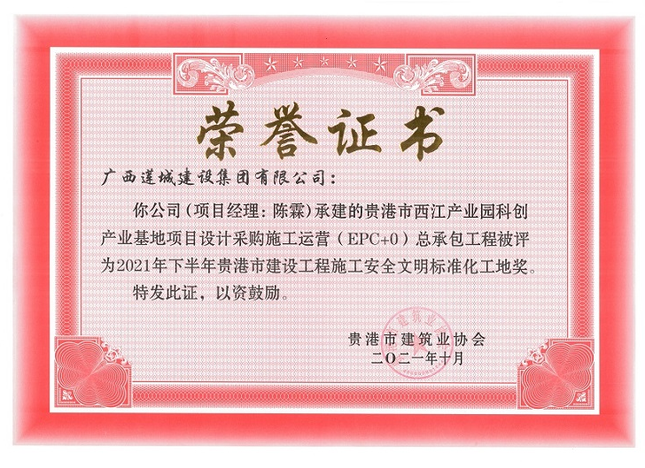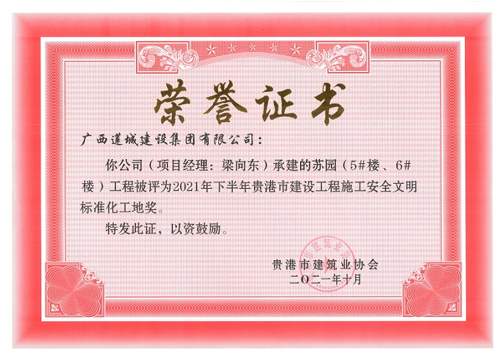 此外,苏园5#楼6#楼、贵港市西江产业园科创产业基地项目设计采购施工运营(EPC+0)总承包工程等两个项目获评“2021年下半年贵港市建设工程施工安全文明标准化工地奖”。